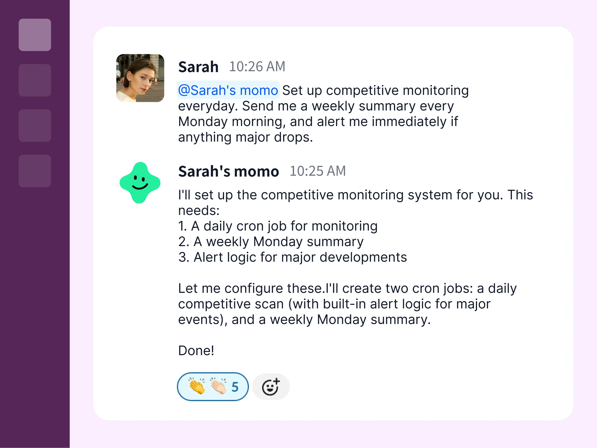 在 Slack 里 @ 它们——它们回复、追问细节、把完成的工作放进你的共享空间。